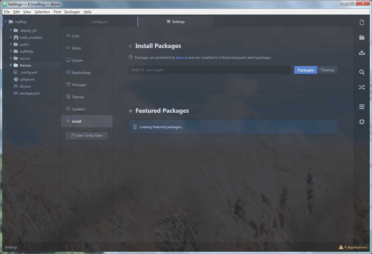 我们打开atom,在settings中会找到”Install”选项,我们可以在搜索框中查找所需的插件并安装。